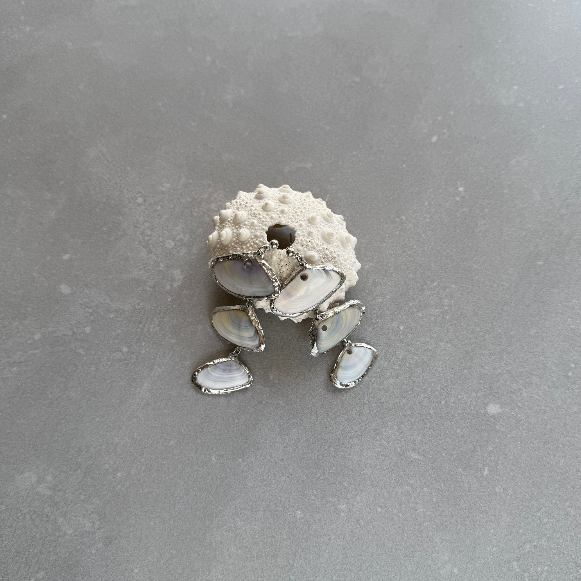 Boucles d'oreilles réalisées à partir de coquillages ramassés à Agde, entourés de soudure à l'étain.