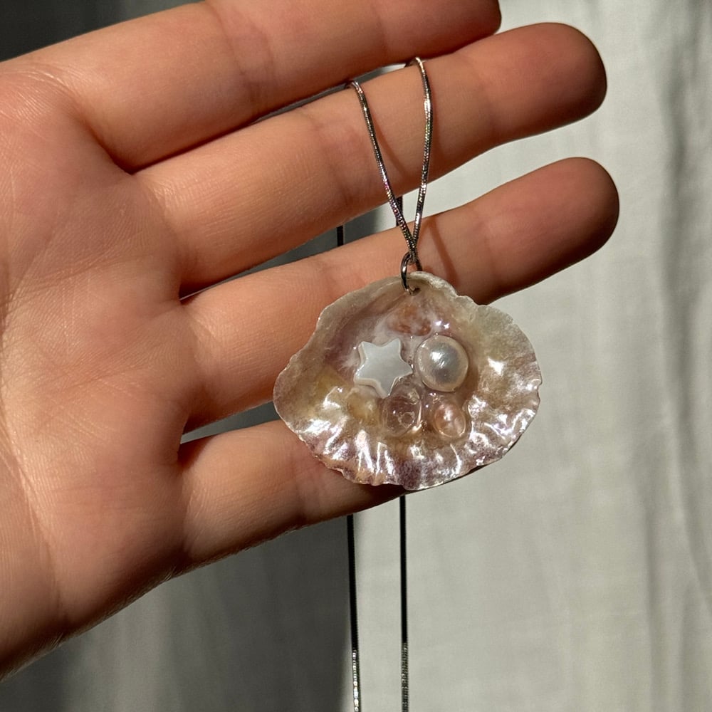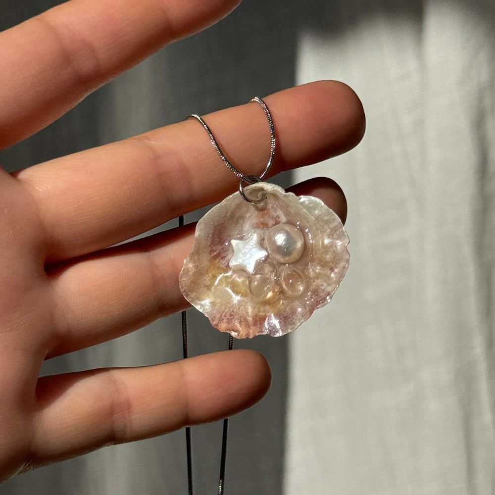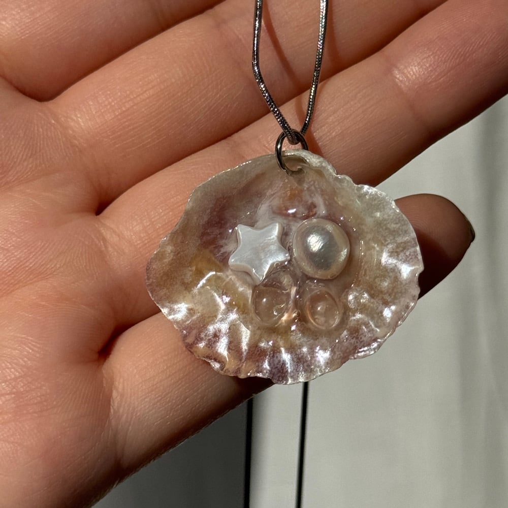 Collier en acier inoxydable, orné d’une coquille de nacre rose pale.
