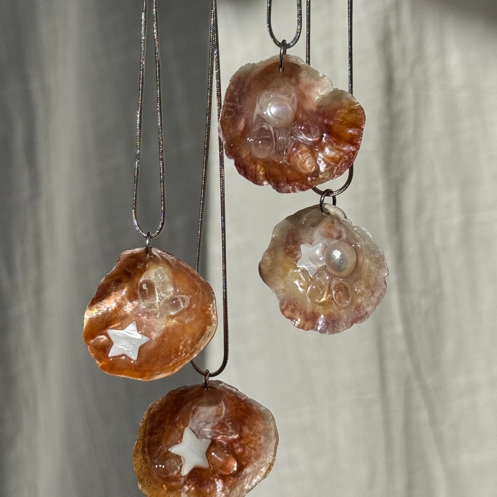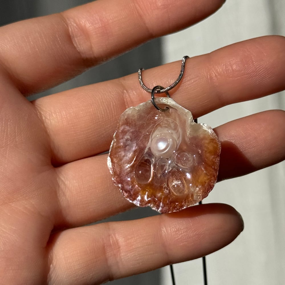 Collier en acier inoxydable, orné d’une coquille de nacre rose.