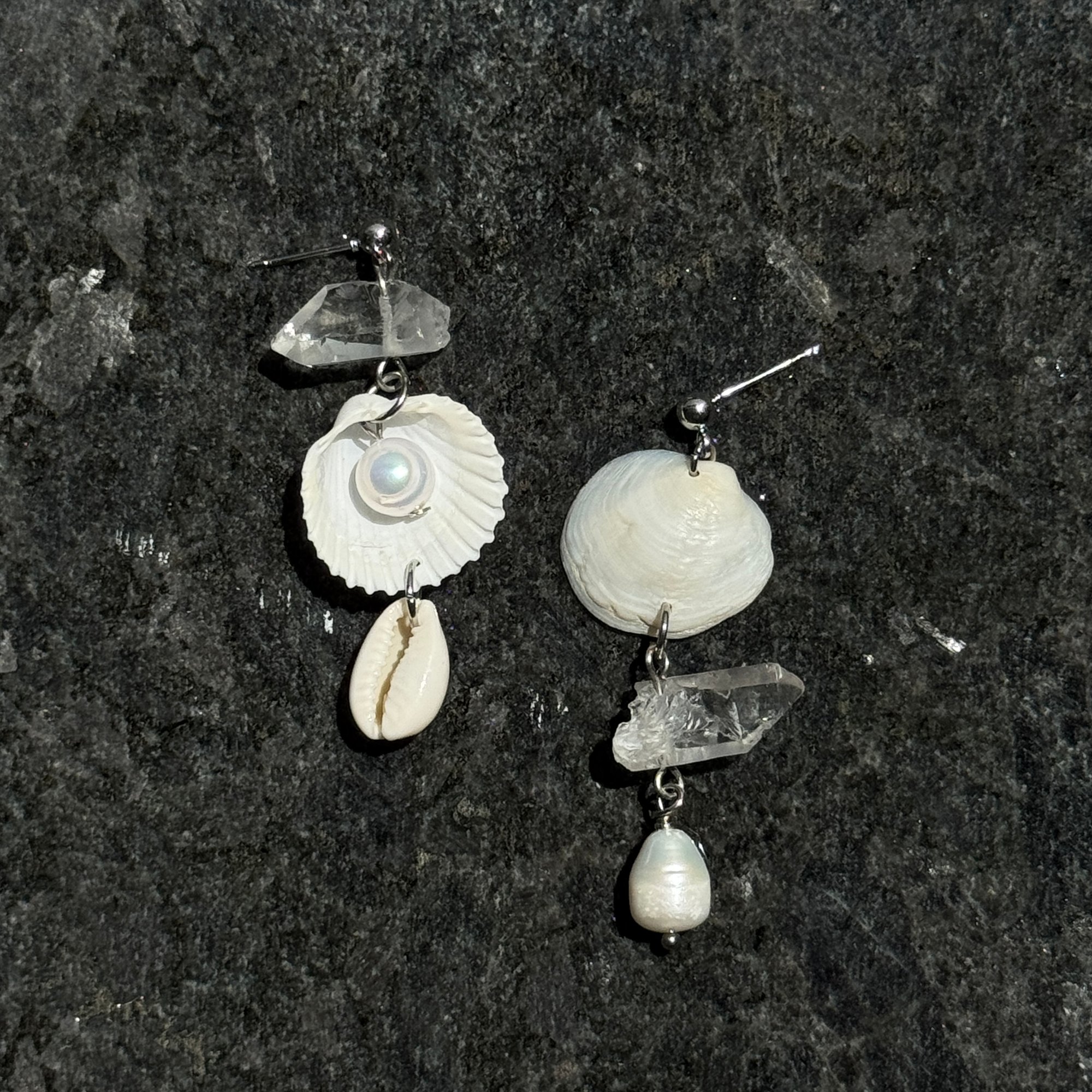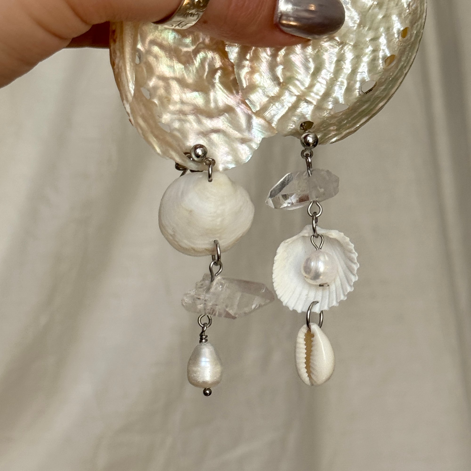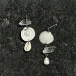 Boucles d'oreilles réalisées à partir de coquillages trouvés à Agde et au Mexique, perles de nacre blanches, et quartz blanc.